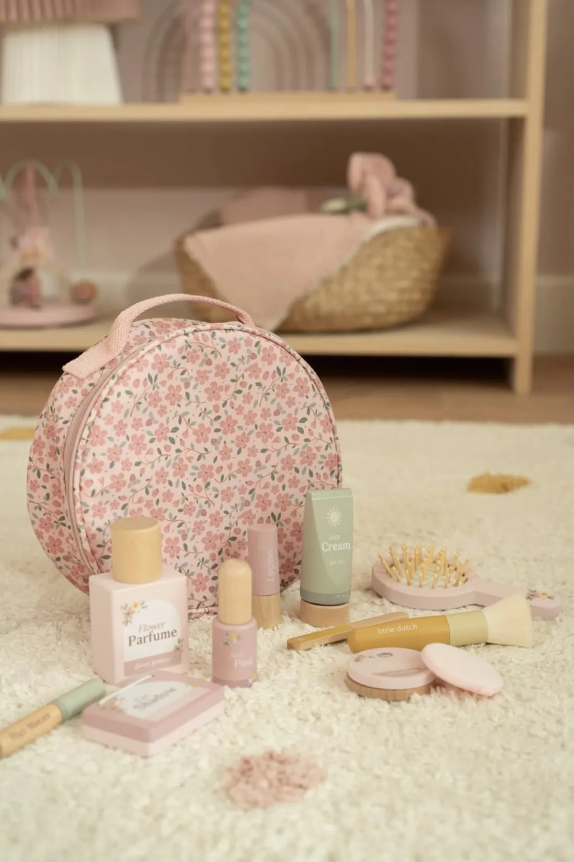 Met de Little Dutch make-up set kunnen kinderen op een veilige en fantasierijke manier kennismaken met make-up. De set bevat houten accessoires zoals een lipstick, nagellak, parfum en een spiegeltje, allemaal uitgevoerd in zachte kleuren en zonder echte cosmetica. Dit maakt het spelen volledig veilig en zorgeloos.