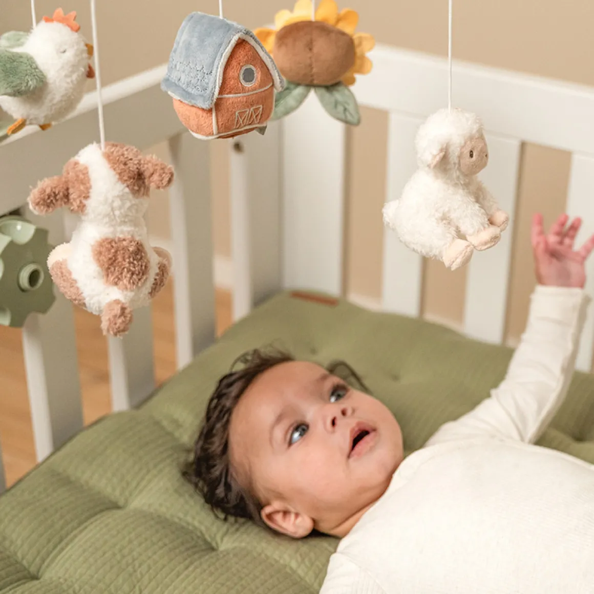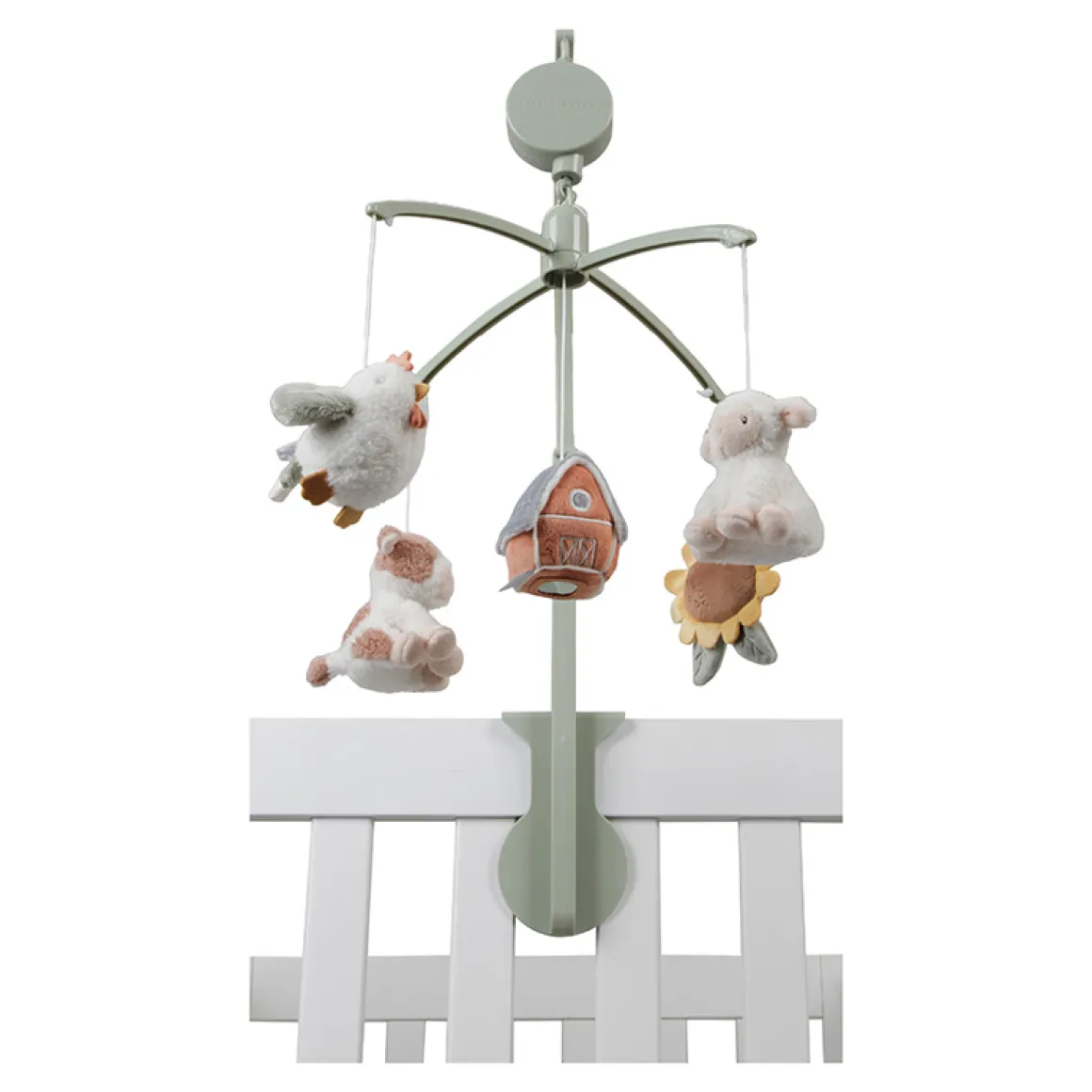 Dankzij het gebruiksvriendelijke bevestigingssysteem kan je de Little Dutch Muziekmobiel Little Farm gemakkelijk aan de wieg of de ledikant van je kind bevestigen.