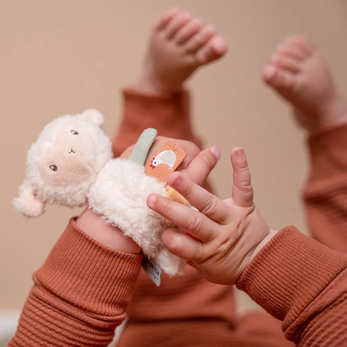 De Little Dutch Polsrammelaar Schaap is niet zomaar een armband; het is een speelse metgezel met een klein knuffelschaapje dat zachtjes rammelt. Het gebruik van knisperend materiaal voegt een extra sensorische dimensie toe aan het speelplezier.