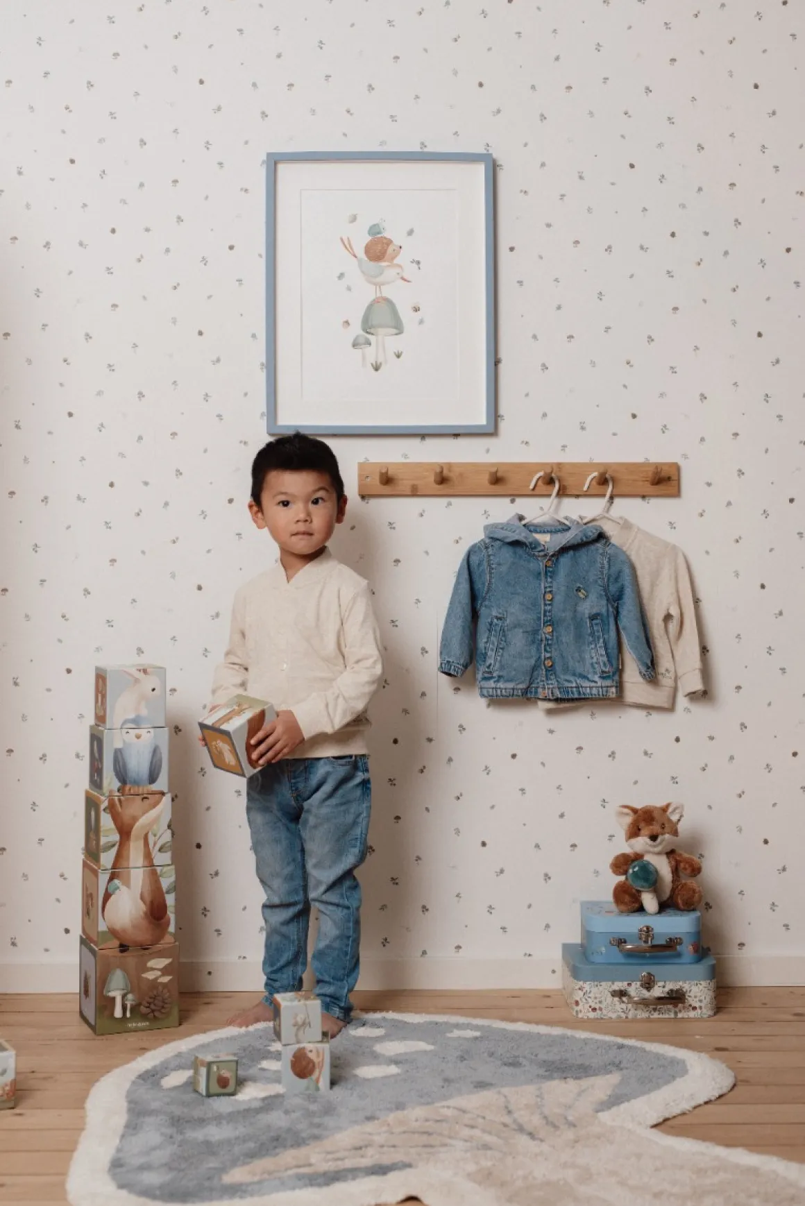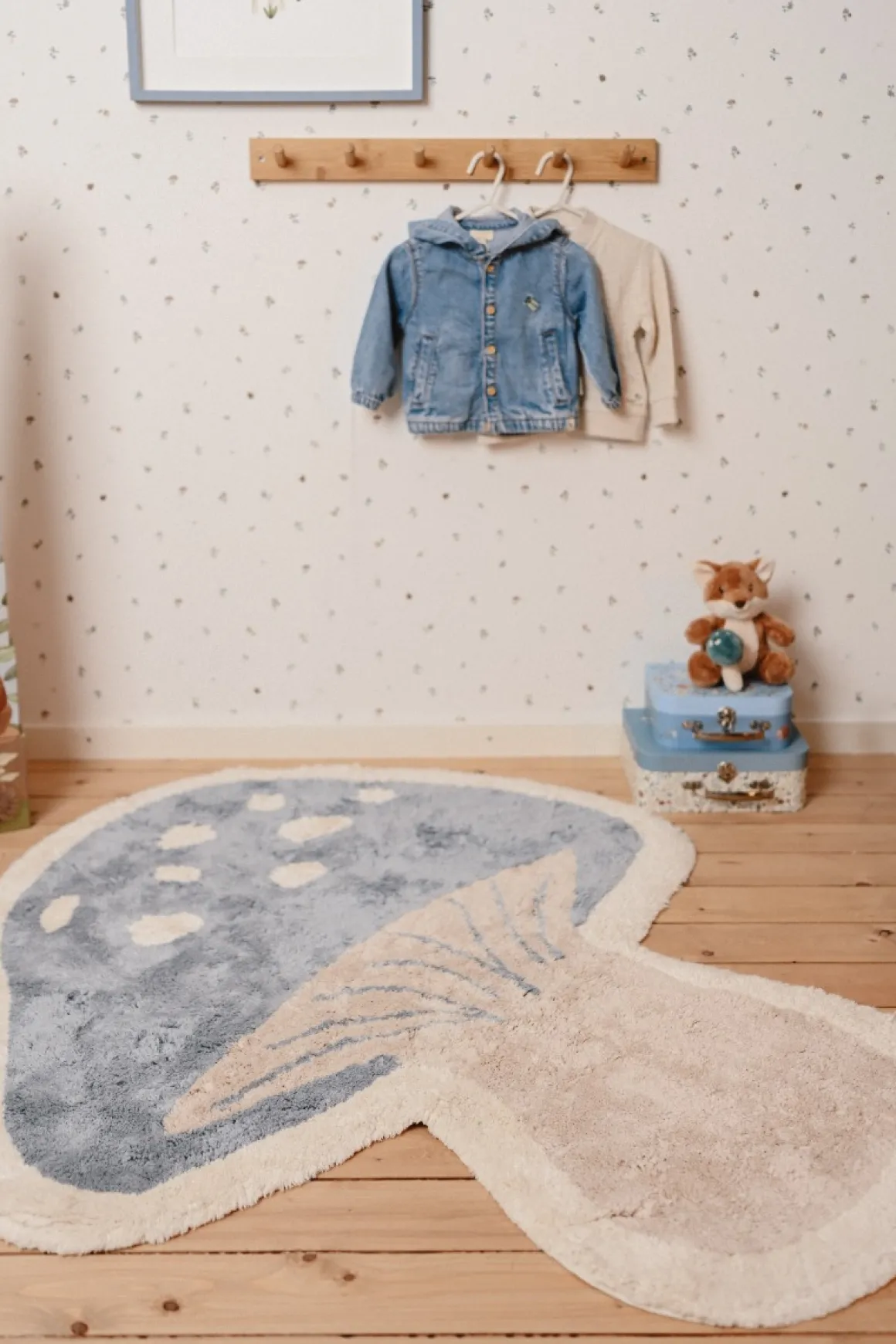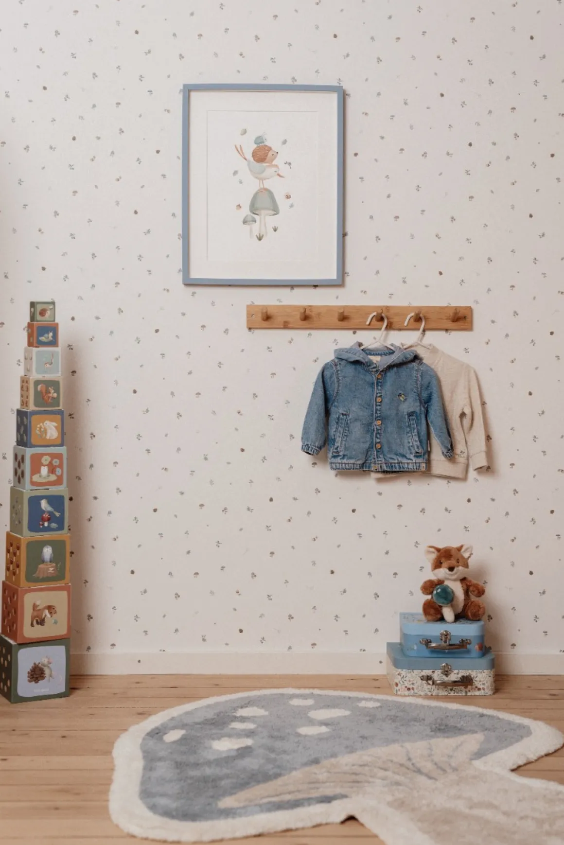 Het Little Dutch Vloerkleed Paddenstoel brengt een vleugje natuur en speelsheid in de kinderkamer. Met zijn charmante paddenstoelvorm en zachte beige basiskleur, aangevuld met bosblauwe accenten, is dit kleed een prachtige toevoeging aan de ruimte. Het design straalt warmte en gezelligheid uit, waardoor de kamer een fijne plek wordt om te spelen, ontspannen en groeien.