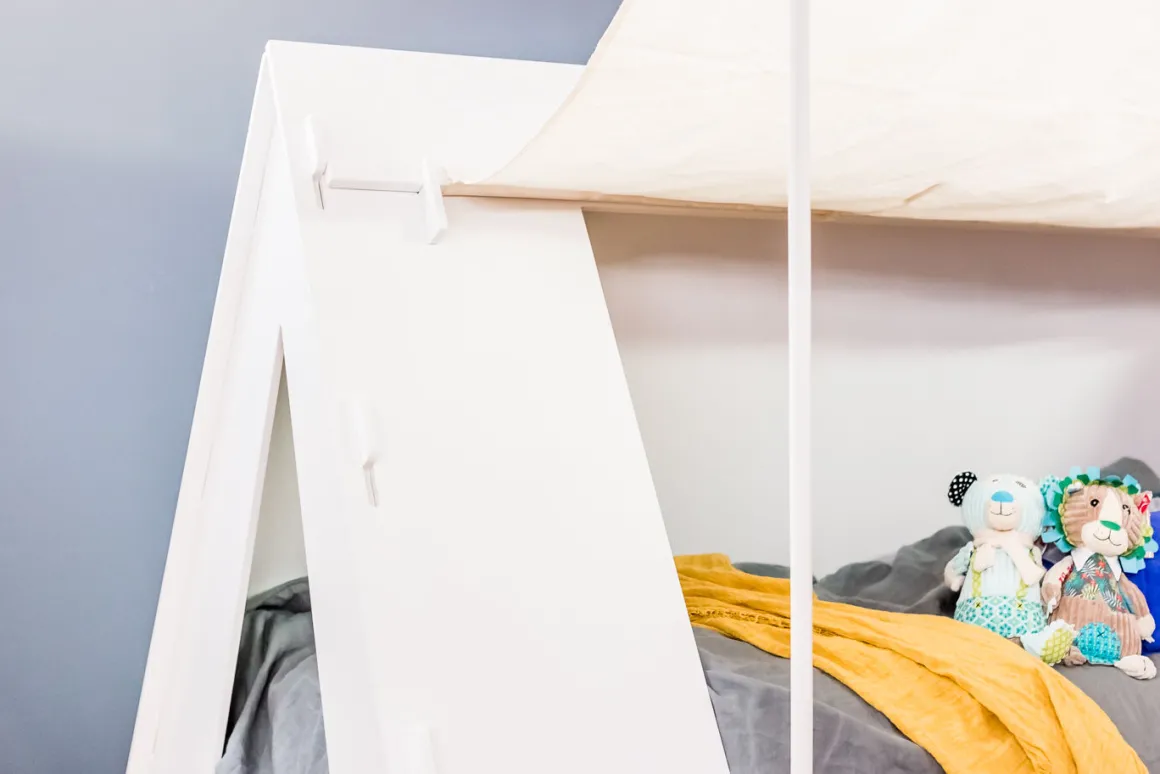 Het Mathy by Bols tentbed brengt direct sfeer in de kinderkamer! Dit speelse kinderbed is voorzien van een linnen dakje waardoor je direct het vakantie gevoel ervaart tijdens het slapen.