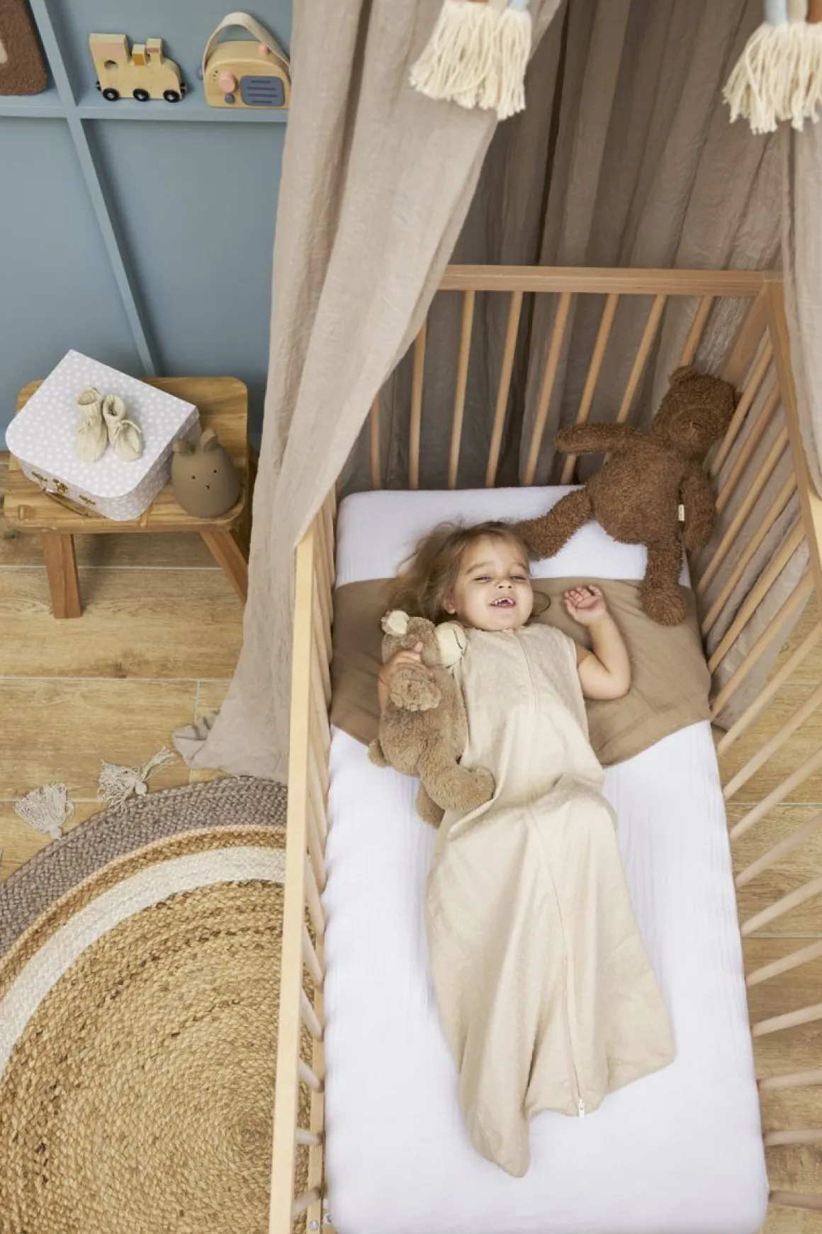 Deze babyslaapzak is vervaardigd uit 100% zacht geweven katoen, waardoor het ideaal is voor de warmere dagen en nachten. Het katoen biedt uitstekende ademende eigenschappen, reguleert vocht goed en zorgt ervoor dat je kleintje op de juiste temperatuur blijft, zelfs tijdens zomerse hitte.