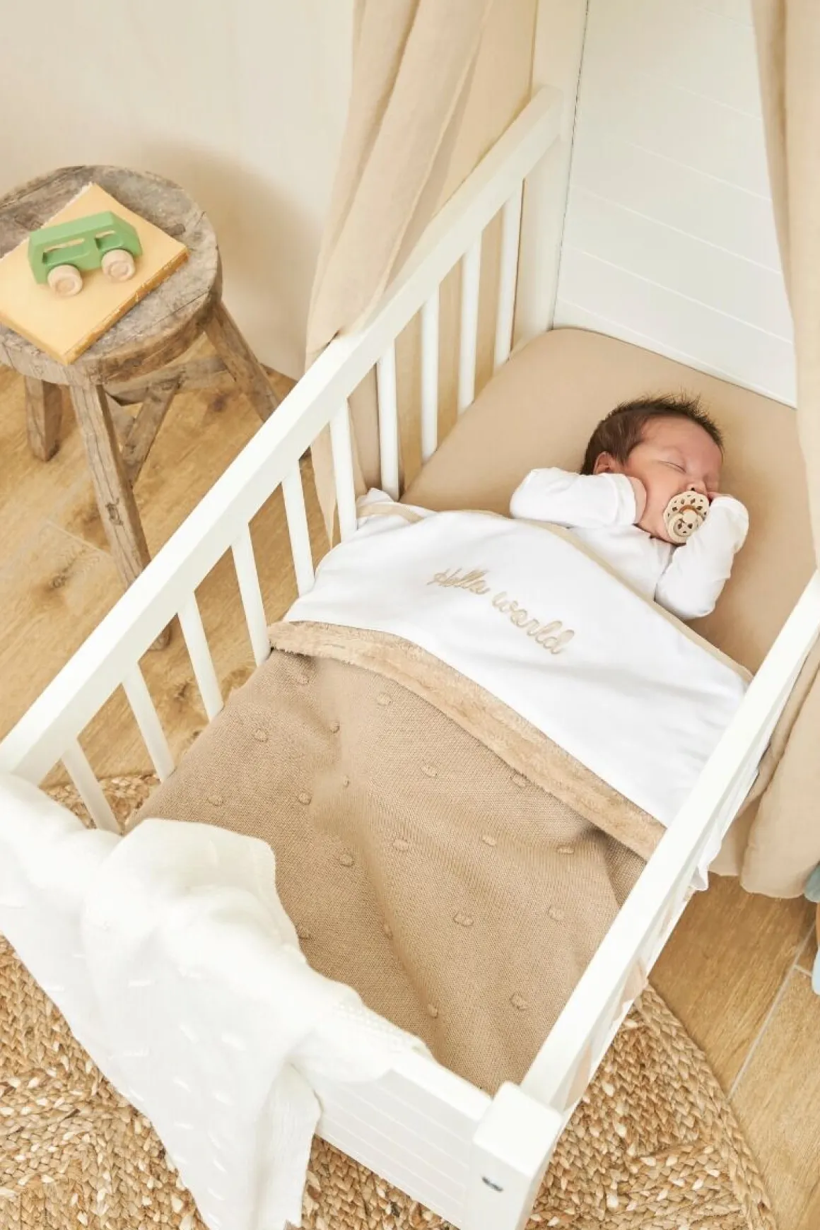 De Meyco Ledikantdeken Mini Knots Sand 100 x 150 cm is heerlijk zacht en zorgt dat jouw kleine heerlijk comfortabel ligt! Dit dekentje lucht goed door!