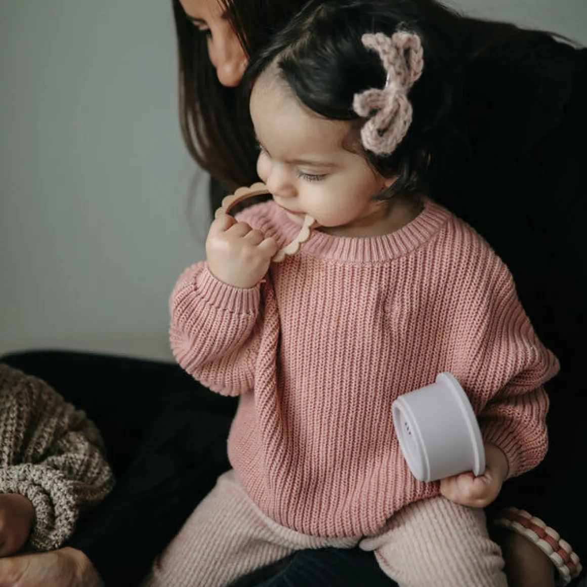 Komen de eerste tandjes van je kindje door? Mushie to the rescue! Deze toffe bijtring armbanden hebben een fijne ribbelvorm die het tandvlees van je kindje verzacht bij het bijten. Gemaakt van 100% non-toxic silliconen.