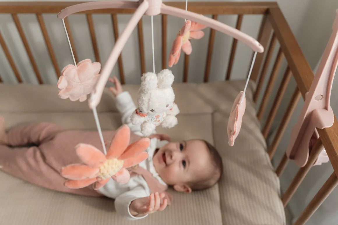 De Nijntje Muziekmobiel Lucky Blossom is de perfecte manier om je kleintje te kalmeren en te vermaken. Aan de vrolijke muziekmobiel hangen schattige Nijntje knuffels en hij speelt een rustgevende melodie af die helpt om je baby sneller in slaap te laten vallen.Â