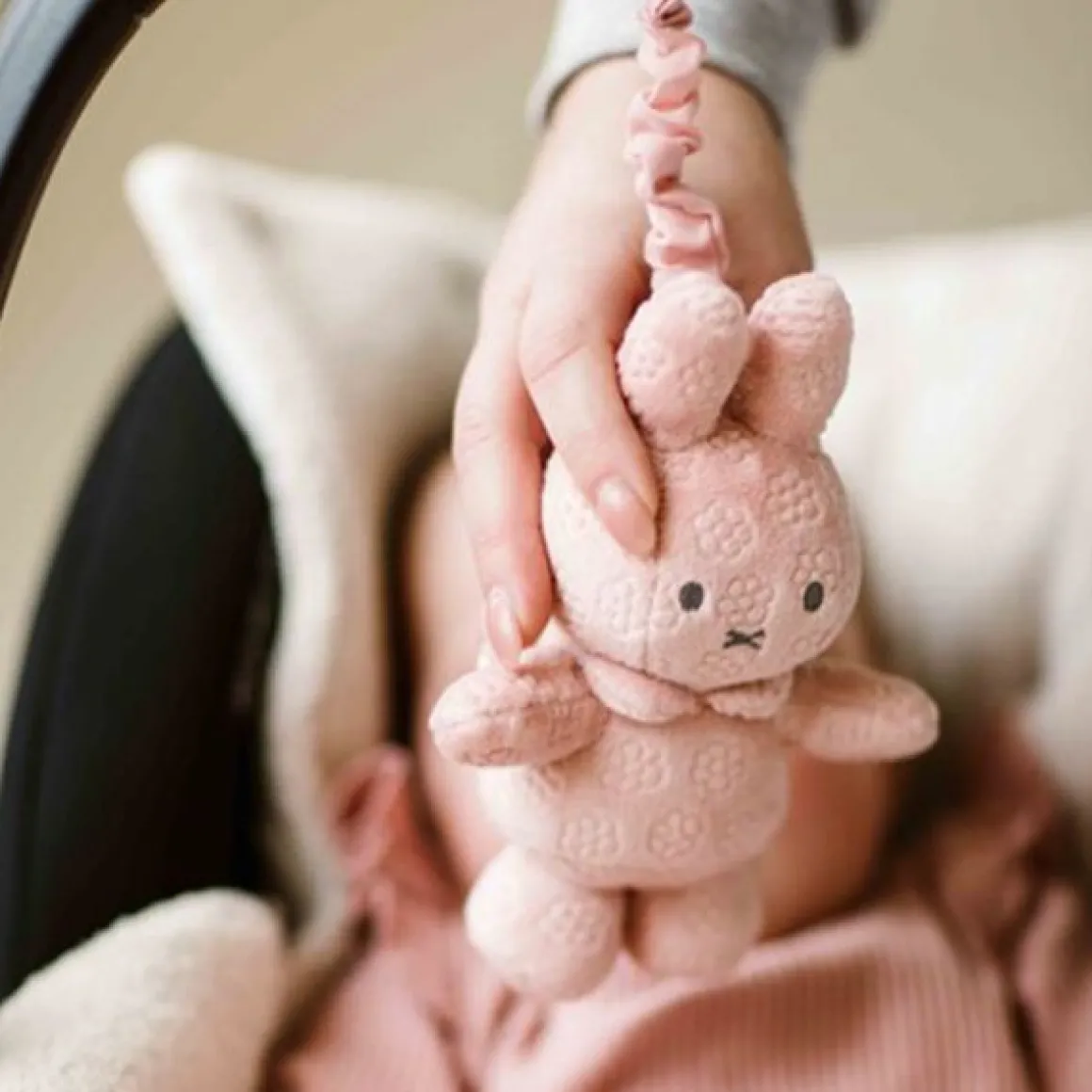 De Nijntje Trilfiguur is gemaakt van gerecycled pluche en heeft geborduurde details, waardoor hij volledig veilig is voor de allerkleinsten. De zachte kleur en het subtiele bloemenpatroon geven het speeltje bovendien een stijlvolle uitstraling, passend bij iedere babyuitzet.