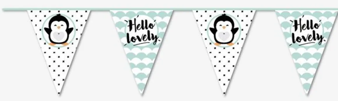Op de vlaggetjes staan leuke teksten en afbeeldingen van schattige pinguïns.