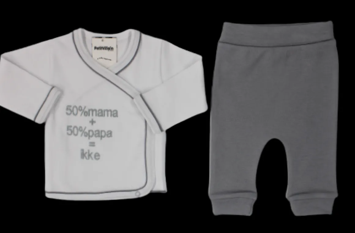 Het broekje is voorzien van een elastische tailleband zodat deze nooit te strak rond de buik van je kleintje zit, ideaal! Het shirtje heeft een eenvoudige overslagsluiting van drukknoopjes zodat aan- en uitkleden kinderspel wordt. De leuke tekstopdruk ‘50% Mama + 50% Papa = ikke’ maakt dit setje af!
