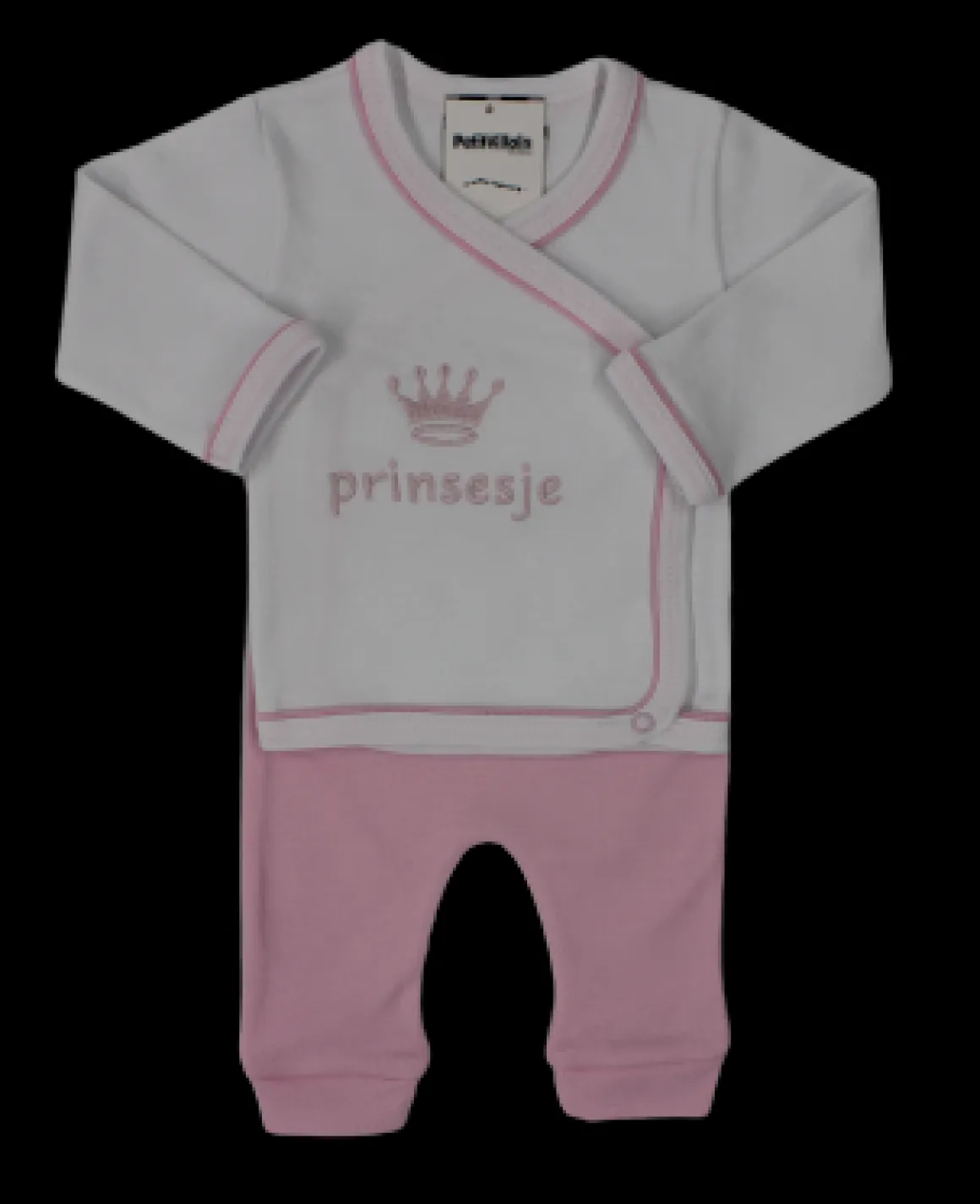 Het broekje is voorzien van een elastische tailleband zodat deze nooit te strak rond de buik van je kleintje zit, ideaal! Het shirtje heeft een eenvoudige overslagsluiting van drukknoopjes zodat aan- en uitkleden kinderspel wordt. De leuke tekstopdruk ‘Prinsesje’ met het geborduurde kroontje maakt dit setje af!