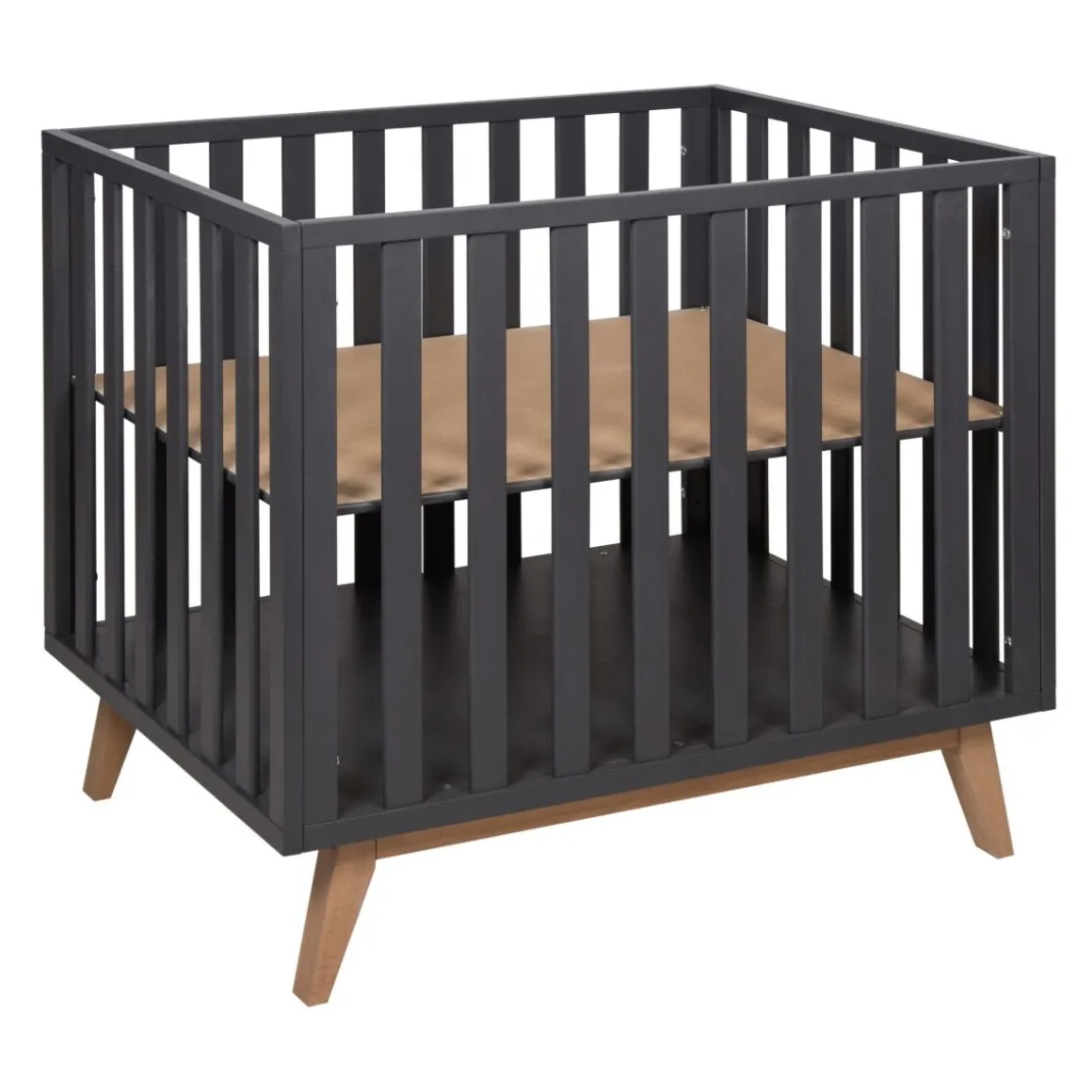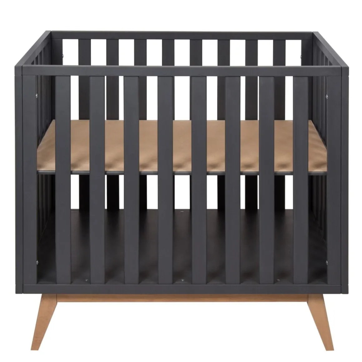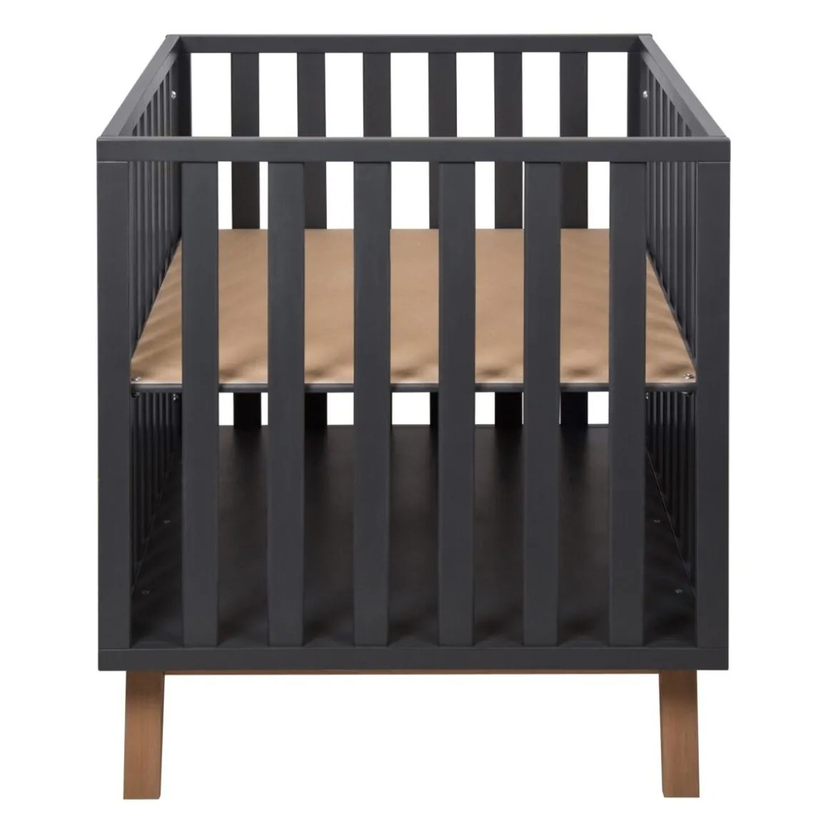 De Quax babybox Romain Moonshadow staat op schuine beuken pootjes en heeft een unieke look! Je kunt de bodem van de Quax Romain box eenvoudig in drie hoogtes verstellen.