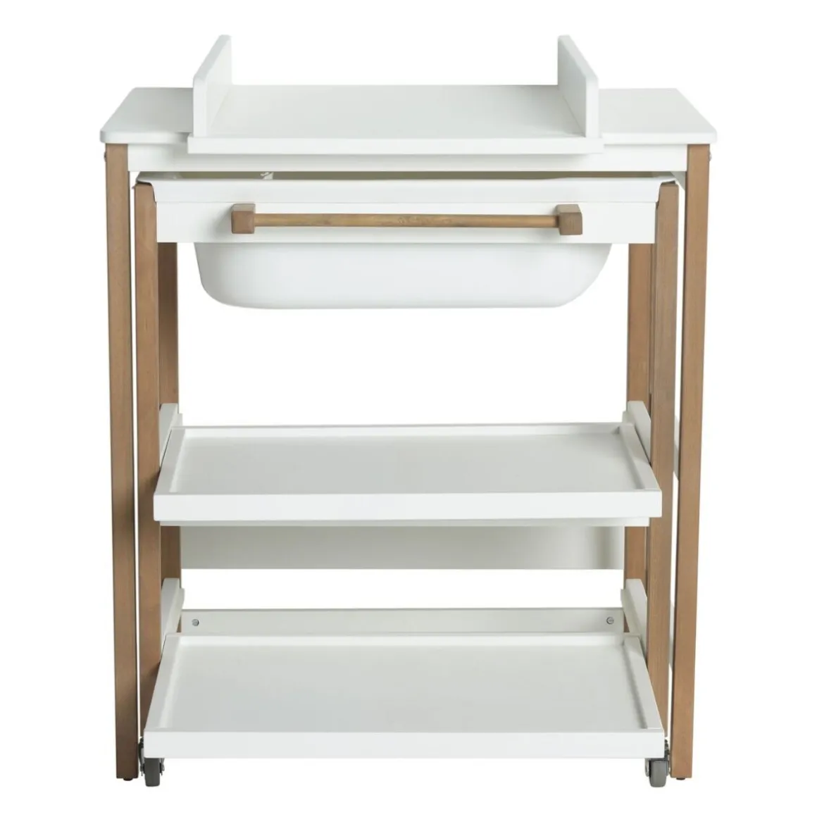 Het luxe Quax Badmeubel Smart White Naturel is niet alleen heel erg praktisch maar ook nog eens heel mooi om neer te zetten! Het badmeubel heeft strakke houtkleurige details en is super handig om jouw kindje in te wassen en op te verschonen. Het meubel bestaat namelijk uit meerdere delen die uit elkaar geschoven kunnen worden. Het bovenste deel van het meubel is een verschoontafel. Daaronder op wieltjes staat een frame met een badje, wat gemakkelijk onder de verschoontafel vandaan geschoven kan worden.