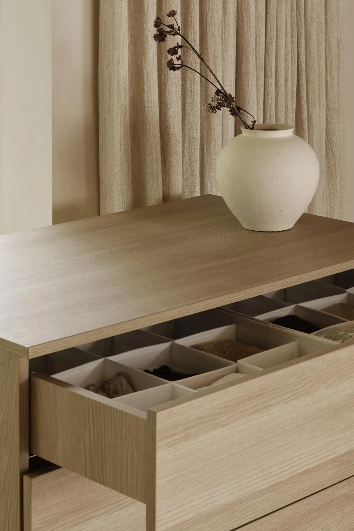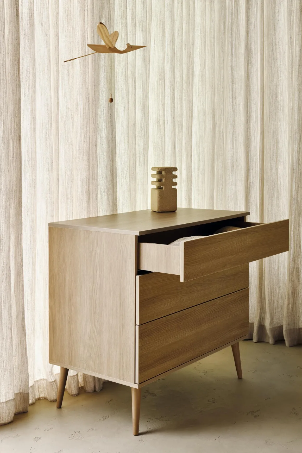 Naast de royale opbergruimte biedt de Flow Commode ook praktische opties. Met een optionele verlenging kan de commode eenvoudig worden omgevormd tot een comfortabele luiertafel. Het verhoogde blad en het uitgebreide luiervlak van 50×70 cm maken verzorgingsmomenten nog makkelijker, zonder in te leveren op stijl of uitstraling.