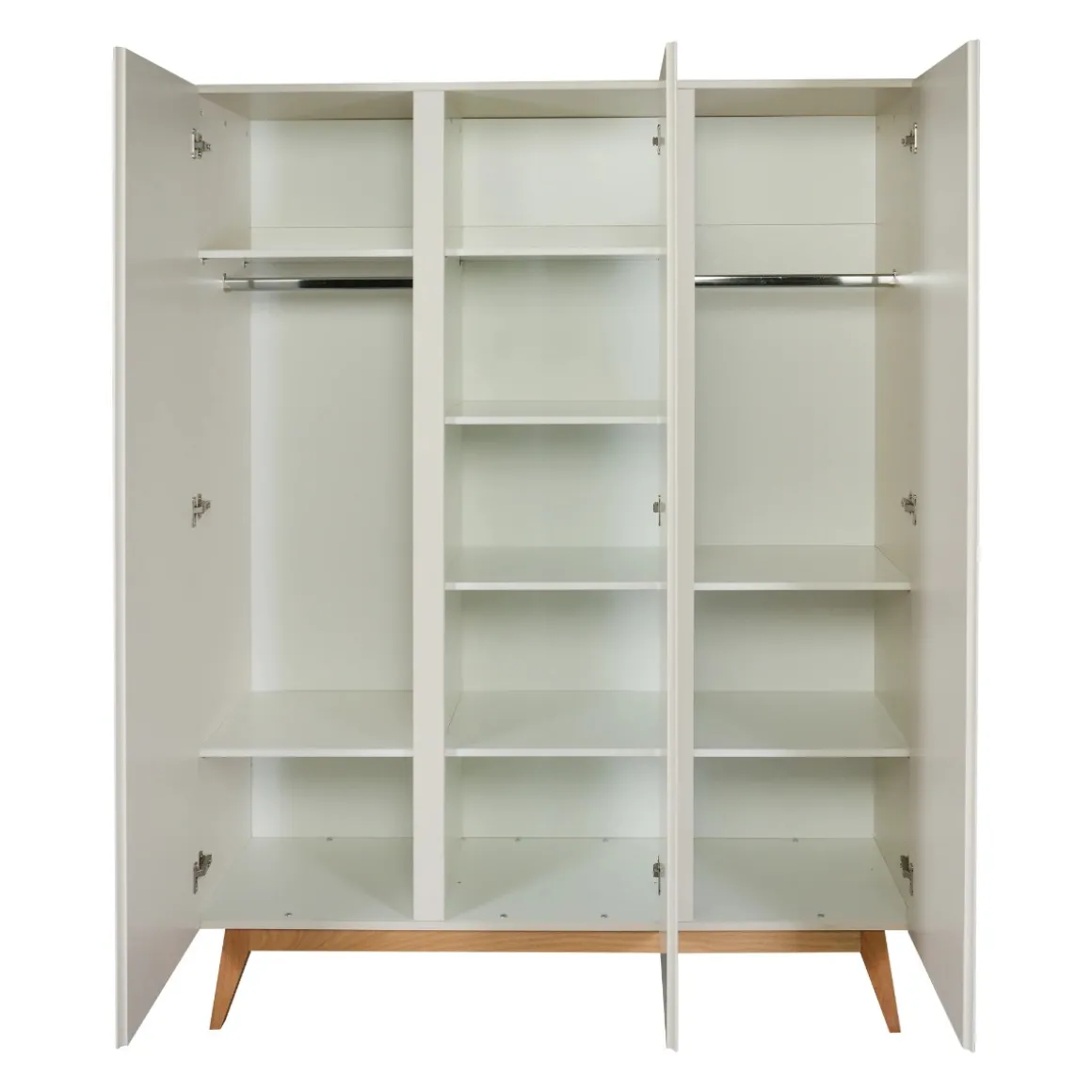 Deze kast is ontworpen met het oog op veelzijdige opbergruimte. De 3 draaideuren onthullen een goed doordacht interieur met 8 legplanken en 3 kleerroedes. Hierdoor kun je de kast naar wens indelen en aanpassen aan de behoeften van de kinderkamer. Of het nu gaat om kleding, speelgoed of andere essentials, deze kast biedt de benodigde opslag.