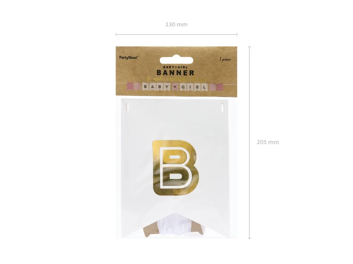 De slinger bestaat uit vlaggetjes met daarop de te tekst BABY GIRL in goudkleurige letters. De slinger kan eenvoudig zelf aan elkaar geregen worden met behulp van het meegeleverde satijnlint. In totaal heeft de slinger 13 vlaggetjes.