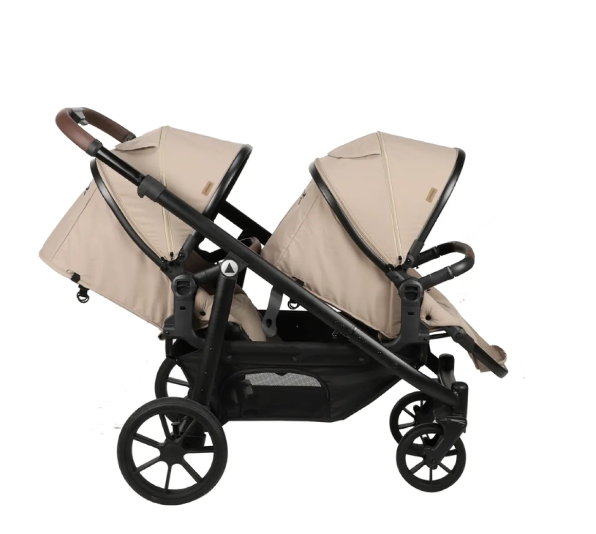 Met grote rubberen wielen die niet lek kunnen gaan en vering op alle wielen, is deze duowagen ontworpen voor duurzaamheid en veiligheid. Het inklapbare ontwerp met vergrendeling maakt het gemakkelijk om de duowagen op te bergen of mee te nemen, terwijl de uitneembare en wasbare bekleding zorgt voor eenvoudig onderhoud.