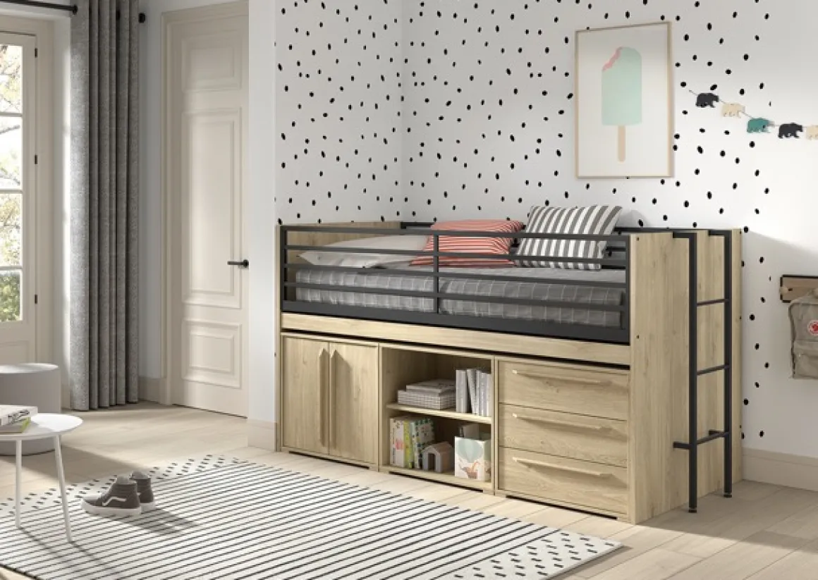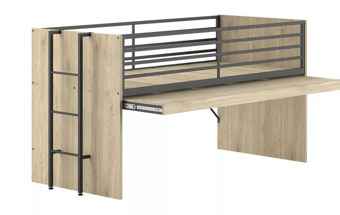 Onder het slaapgedeelte bevindt zich een praktisch uitschuifbaar bureau, dat eenvoudig in- en uit te schuiven is. Dit maakt de halfhoogslaper ideaal voor kinderen en tieners die hun kamer multifunctioneel willen gebruiken. Overdag is er voldoende ruimte om huiswerk te maken of creatief bezig te zijn, en wanneer het bureau niet wordt gebruikt, schuif je het moeiteloos terug onder het bed.